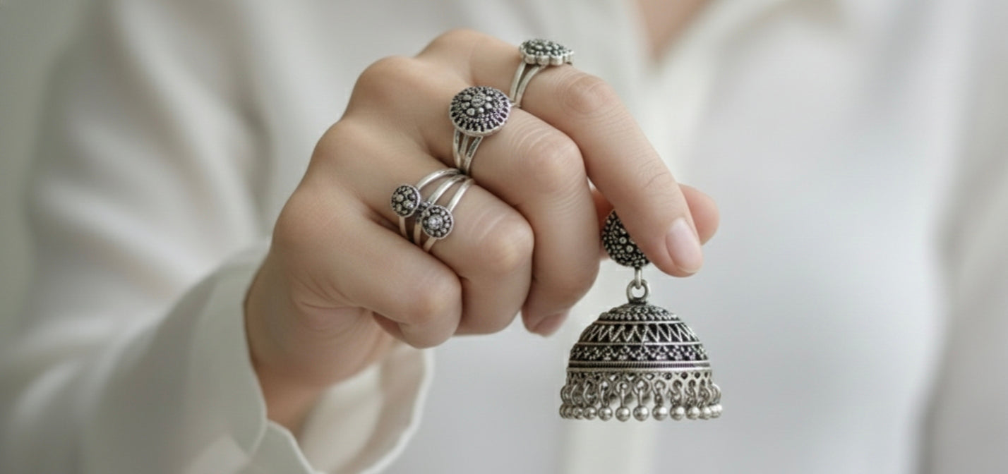 Premium Silver-Plated Oxidized Heart-Shaped Jhumka Earrings for Women (