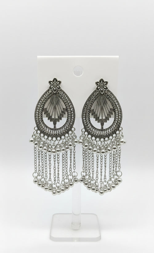 Silver-Toned Oxidized Teardrop Chandbali Earrings with Long Chain Ghungroo Tassels